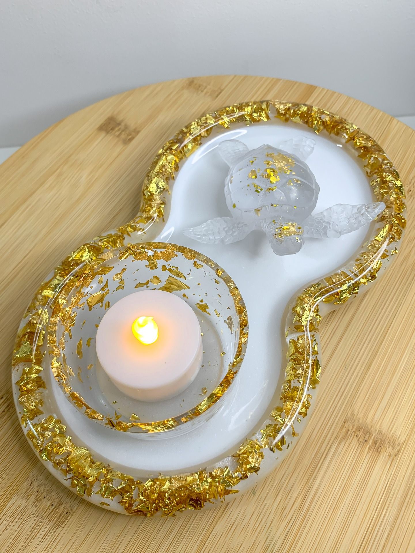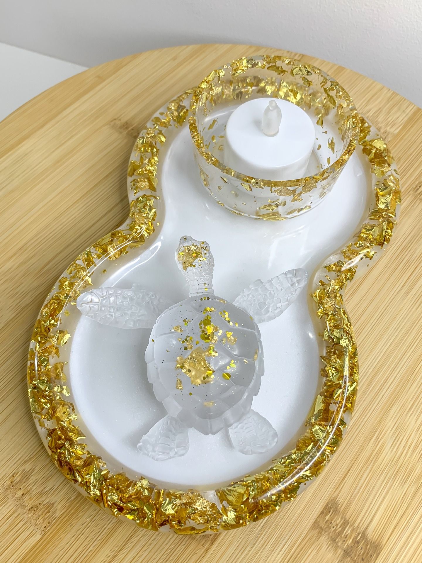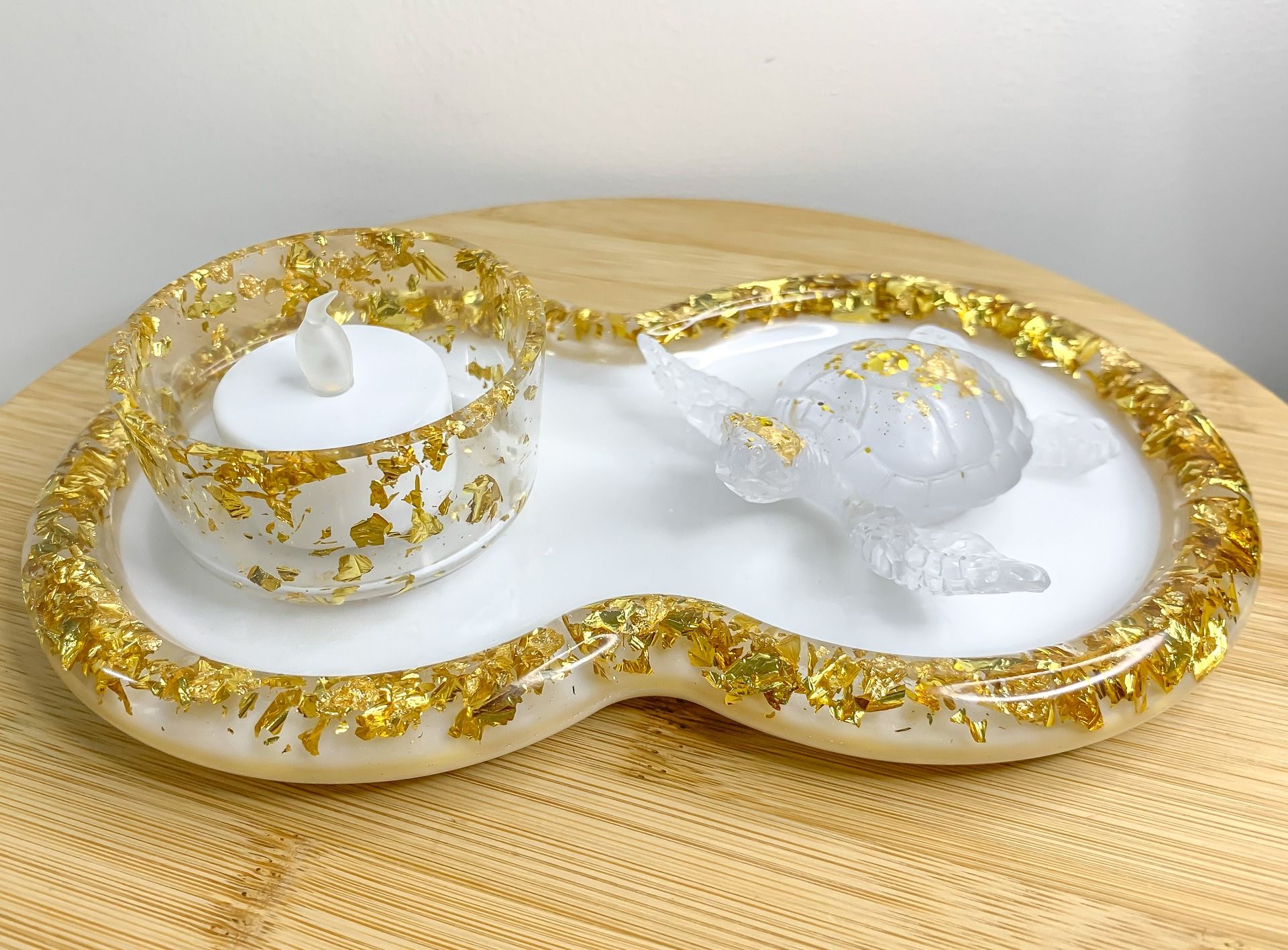 Un joli assortiment blanc nacré et feuilles d'or de 3 créations en résine, comprenant :