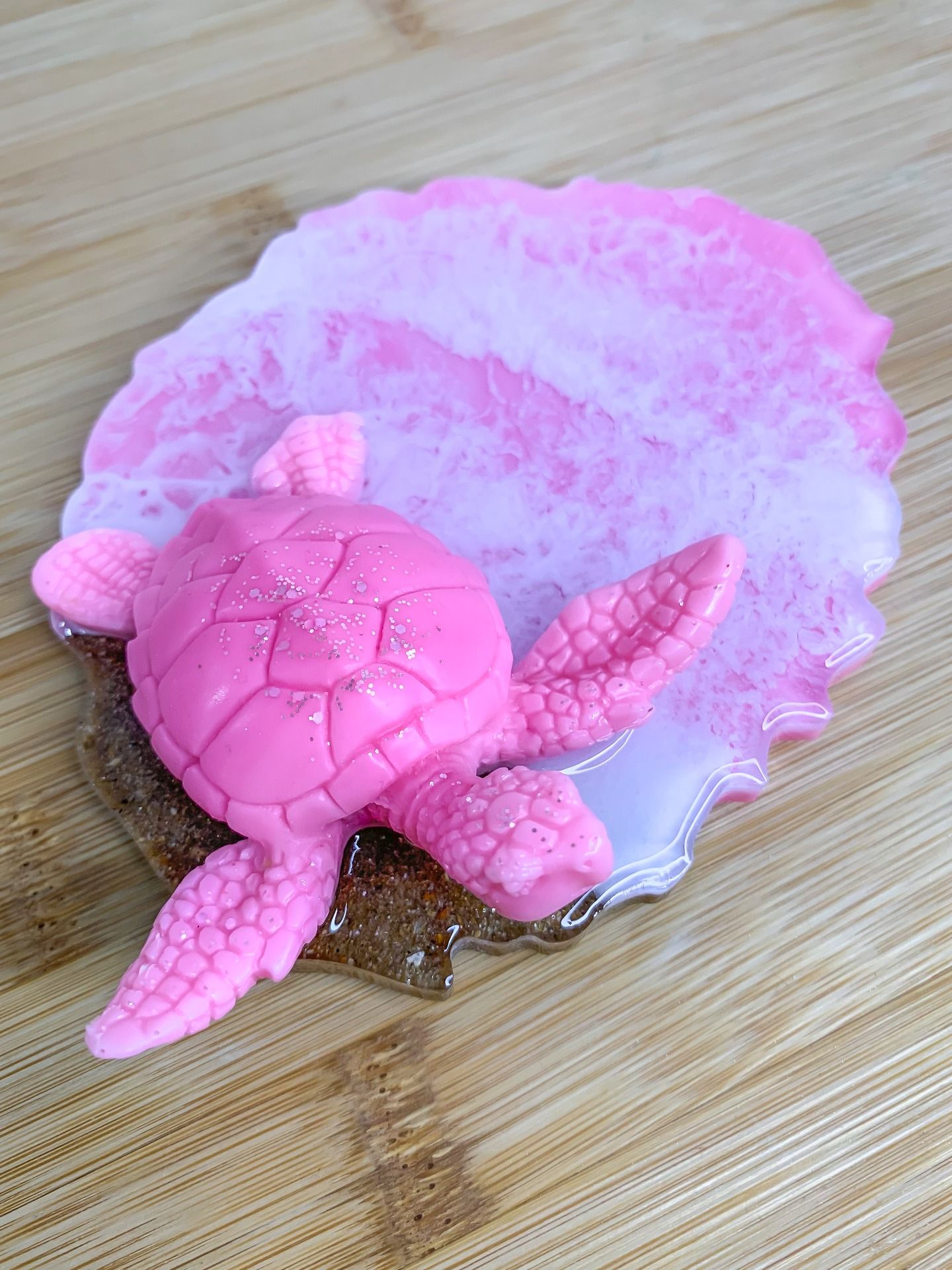 Jolie décoration représentant un océan et sa tortue aux couleurs assorties.