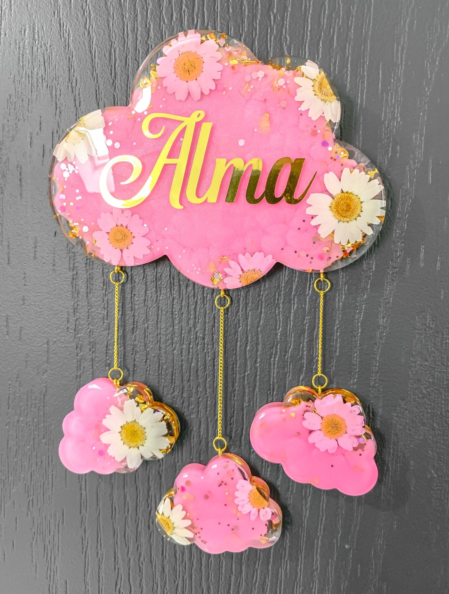Les nuages sont rattachés entre eux par des chaînettes montées à la main (finition or ou argent sélectionnée par mes soins en fonction de vos couleurs choisies pour harmoniser au mieux l'ensemble).